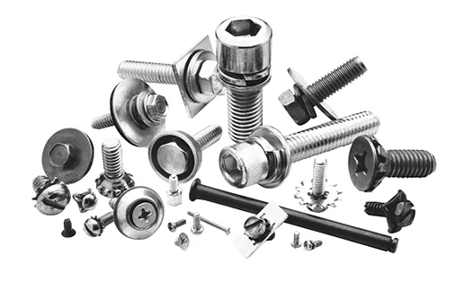 Parafusos, porcas, rebites, arruelas plana e de pressão, buchas de fixação, grampos, abraçadeiras